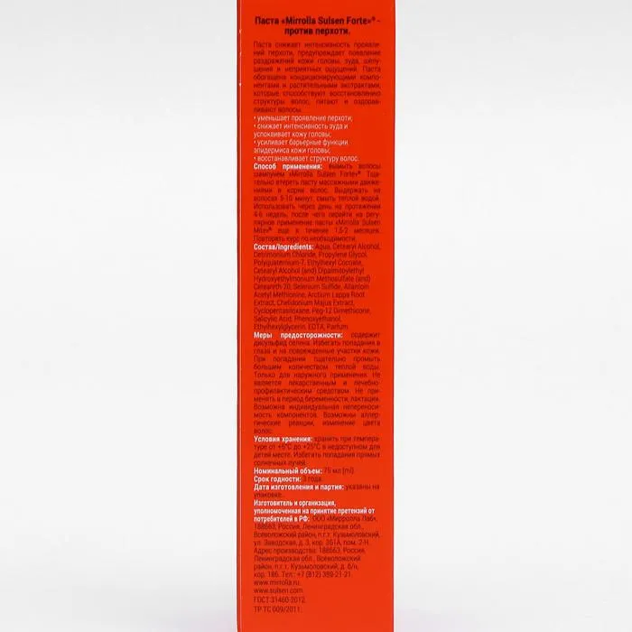 Способ применения: вымыть волосы шампунем Mirrolla Sulsen Forte. Тщательно втереть пасту массажными движениями в корни волос. Выдержать на волосах 5-10 минут, смыть тёплой водой.