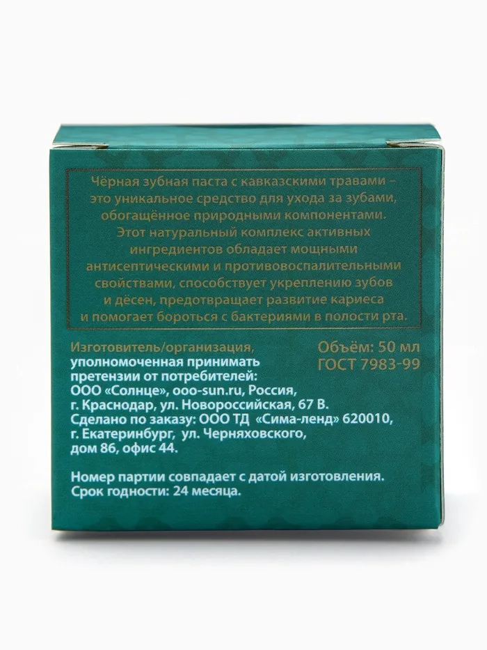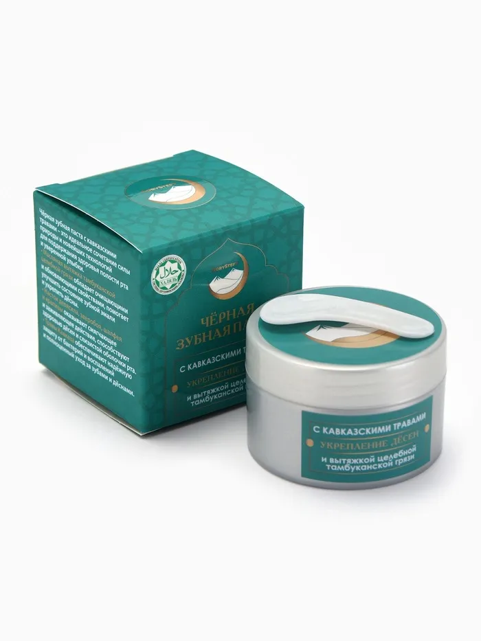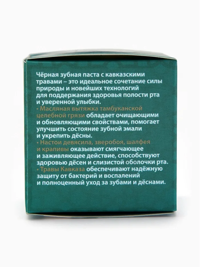 Эта уникальная паста сочетает в себе мощь кавказских трав и современные технологии ухода за полостью рта. Черный цвет пасты обусловлен наличием активированного угля, который глубоко очищает зубы, удаляя налет и токсины, а также отбеливает эмаль естественным образом.