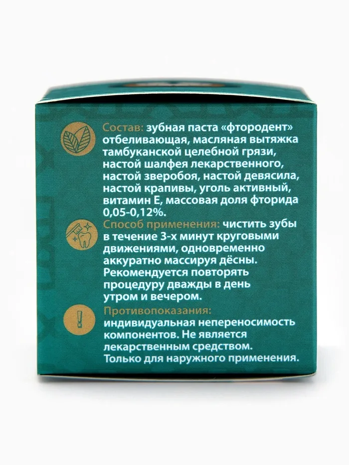 Зубная паста «фтородент» отбеливающая, массовая доля фторида 0,05-0,12%, масляная вытяжка тамбуканской целебной грязи, настой шалфея лекарственного, настой зверобоя, настой девясила, настой крапивы, уголь активный, витамин Е.