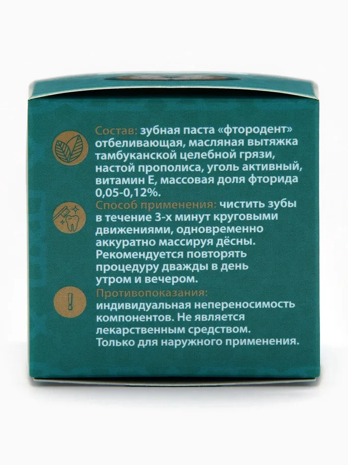 Зубная паста «фтородент» отбеливающая, масляная вытяжка тамбуканской целебной грязи, настой прополиса, уголь активный, витамин Е, массовая доля фторида 0,05-0,12%.