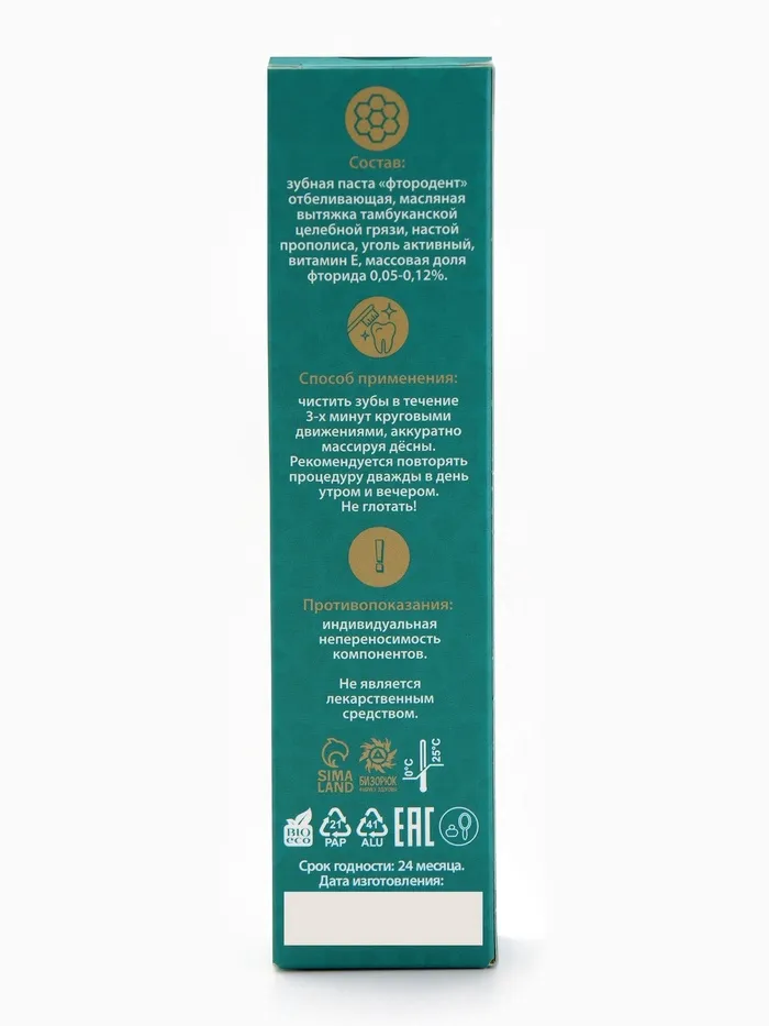 Зубная паста «фтородент» отбеливающая, масляная вытяжка тамбуканской целебной грязи, настой прополиса, уголь активный, витамин Е, массовая доля фторида 0,05-0,12%.
