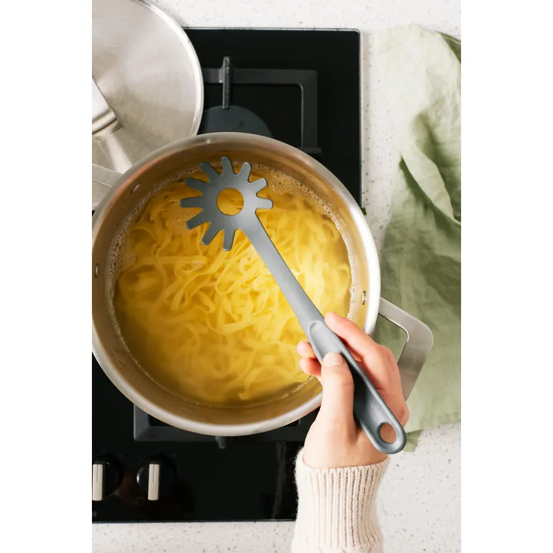 Ложка для пасты GastroMax Bio — это экологичный выбор для вашей кухни. Она идеально подходит для подачи пасты и лапши. Отверстие в центре ложки служит мерой для одной порции. Эта ложка, произведенная в Швеции, имеет более чем на 50% меньший углеродный след по сравнению с традиционными пластиковыми кухонными инструментами. Изготовлена из биопластика, стекловолокна и полиамида. Не царапает покрытые кастрюли и сковородки. Выдерживает температуру до 250 °C и подходит для мытья в посудомоечной машине. Она безопасна для посудомоечной машины и не содержит BPA. Размер: 3 x 6,5 x 28,5 см, цвет серый.