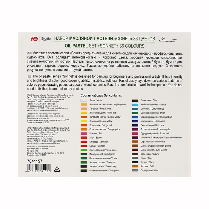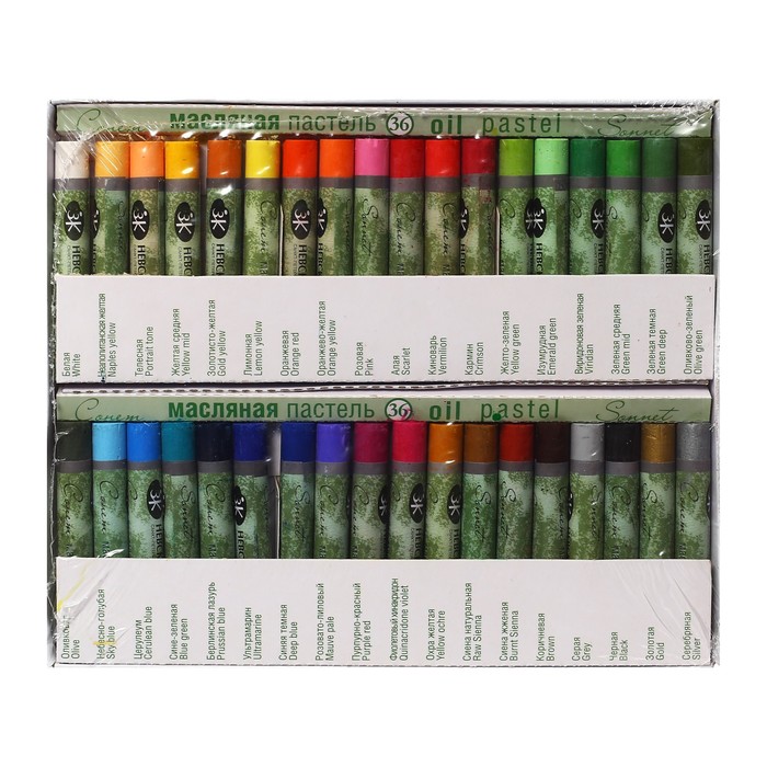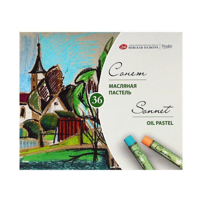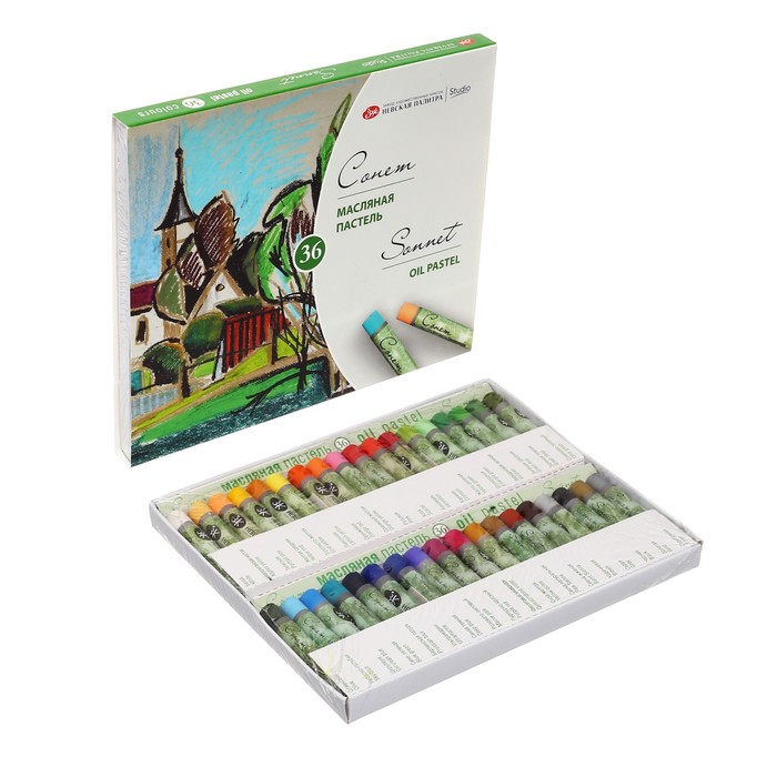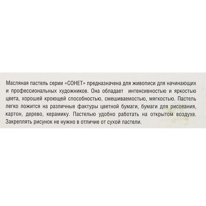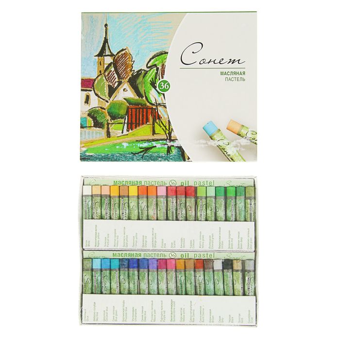Масляная пастель "Сонет" изготовлена из высококачественных материалов. Она обладает интенсивностью и яркостью цвета, хорошей кроющей способностью, смешиваемостью, мягкостью. Пастель легко ложится на различные фактуры - цветную бумагу, бумагу для рисования, картон, дерево, керамику. Пастелью удобно работать на открытом воздухе. Дополнительное закрепление рисунка не требуется. Представлена в наборах по 12, 24 и 36 цветов. Состав набора: белая, неаполитанская желтая, телесная, желтая средняя, золотисто-желтая, лимонная, оранжевая, оранжево-желтая, розовая, алая, киноварь, кармин, желто-зеленая, изумрудная, виридоновая зеленая, зеленая средняя, зеленая темная, оливково-зеленый, оливковая, небесно-голубая, церулеум, сине-зеленая, берлинская лазурь, ультрамарин, синяя темная, розовато-лиловый, пурпурно-красный, фиолетовый хинакридон, охра желтая, сиена натуральная, сиена жженая, коричневая, серая, черная, золотая, серебряная.