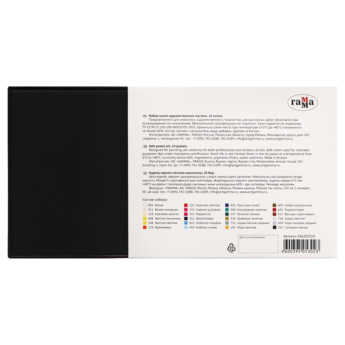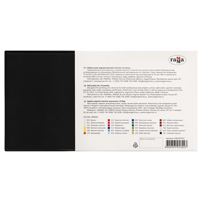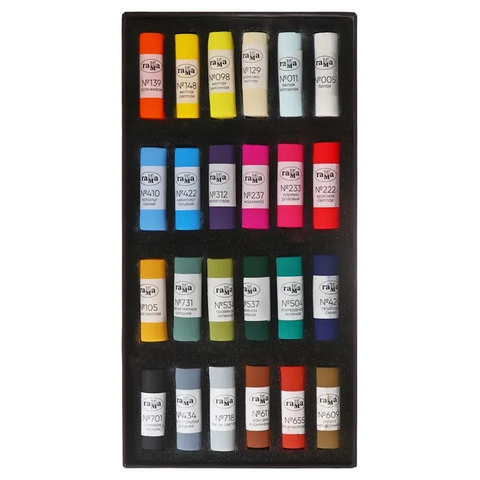 Набор сухой художественной пастели ГАММА состоит из 24 базовых цветов, подходит для профессионалов и начинающих художников.Для производства пастели используются тонкотертые пигменты и каолиновая глина высочайшего качества. Каждый мелок круглой формы оптимально мягкий и в меру хрупкий. Диаметр мелка составляет 1,5 см, а длина – 4,8 см. Художественная пастель ГАММА обладает глубиной и интенсивностью цвета. Цвета в палитре легко смешиваются между собой и создают мягкие переходы одного оттенка к другому. Цвета ровно ложатся на бумагу разных фактур. Набор упакован в картонную коробку.Диаметр мелка: 1,5 см;Длина мелка: 4,8 см.