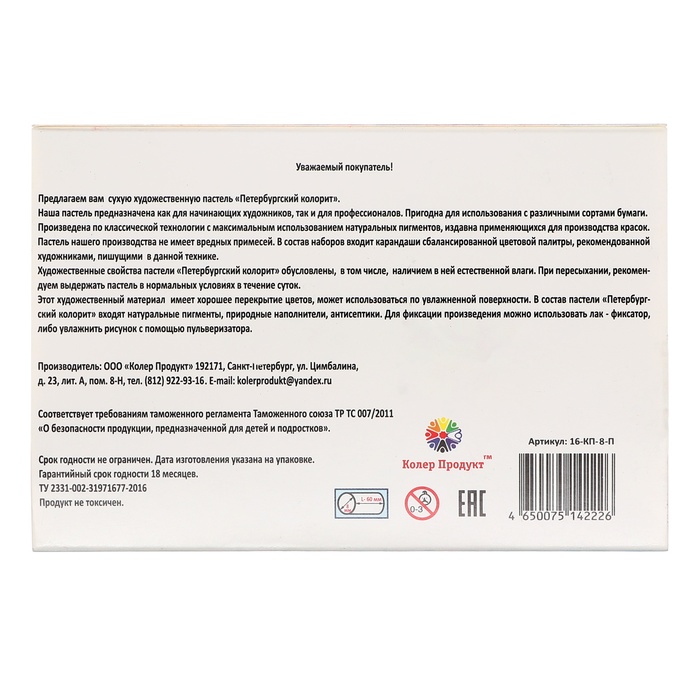 Состав пастели "Петербургский колорит" это натуральные пигменты, природные наполнители, антисептики. Соответствует требованиям таможенного регламента Таможенного союза ТР ТС 007/2011 "О безопасности продукции, предназначенной для детей и подростков".
