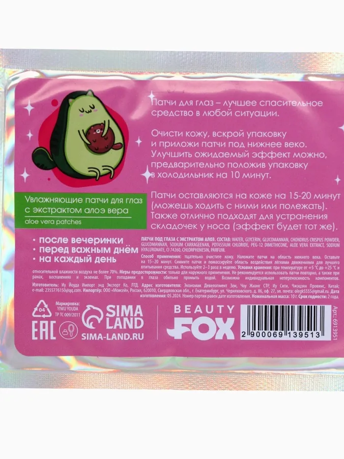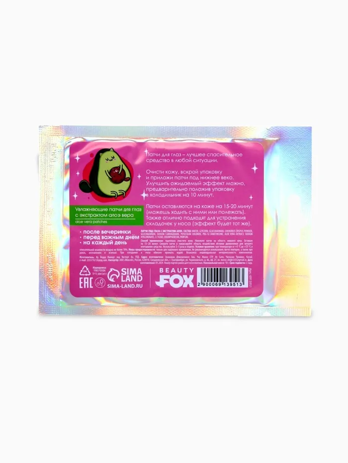 Патчи для глаз «Мой стиль-авокадо», 1 пара, гидрогелевые с экстрактом алое, Beauty Fox — Характеристики