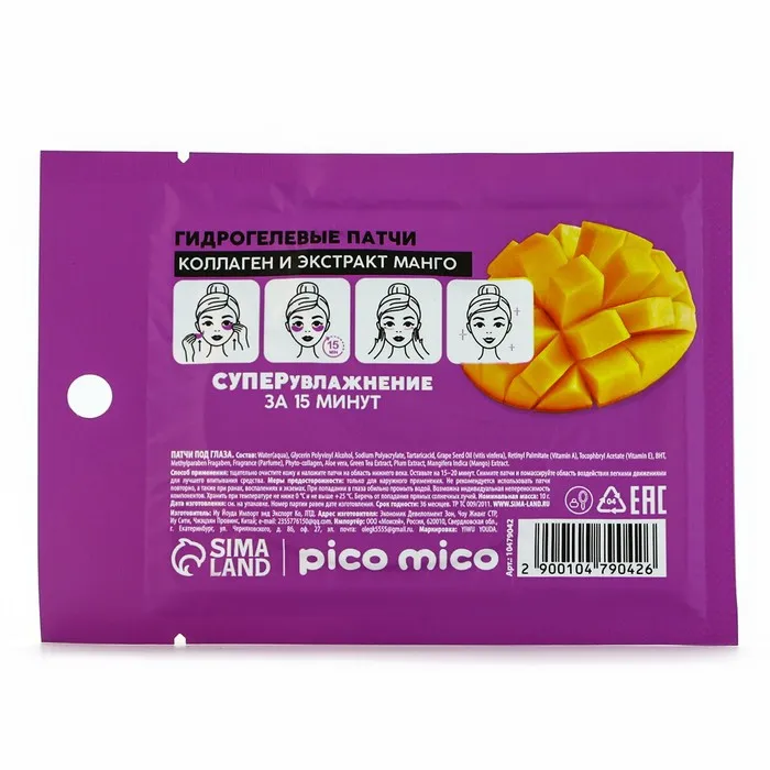 Патчи для области вокруг глаз Fresh mango boom, 1 пара, гидрогелевые с коллагеном и экстрактом манго, PICO MICO — Характеристики