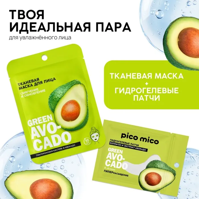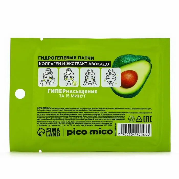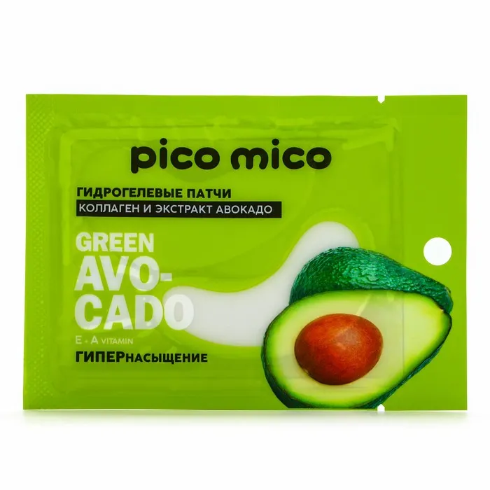 Патчи для области вокруг глаз Green avokado, 1 пара, гидрогелевые с коллагеном и экстрактом авокадо, PICO MICO — Характеристики