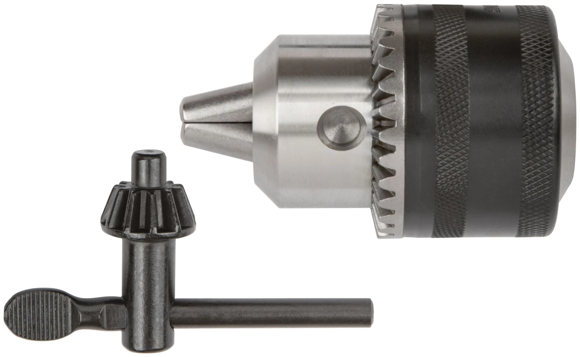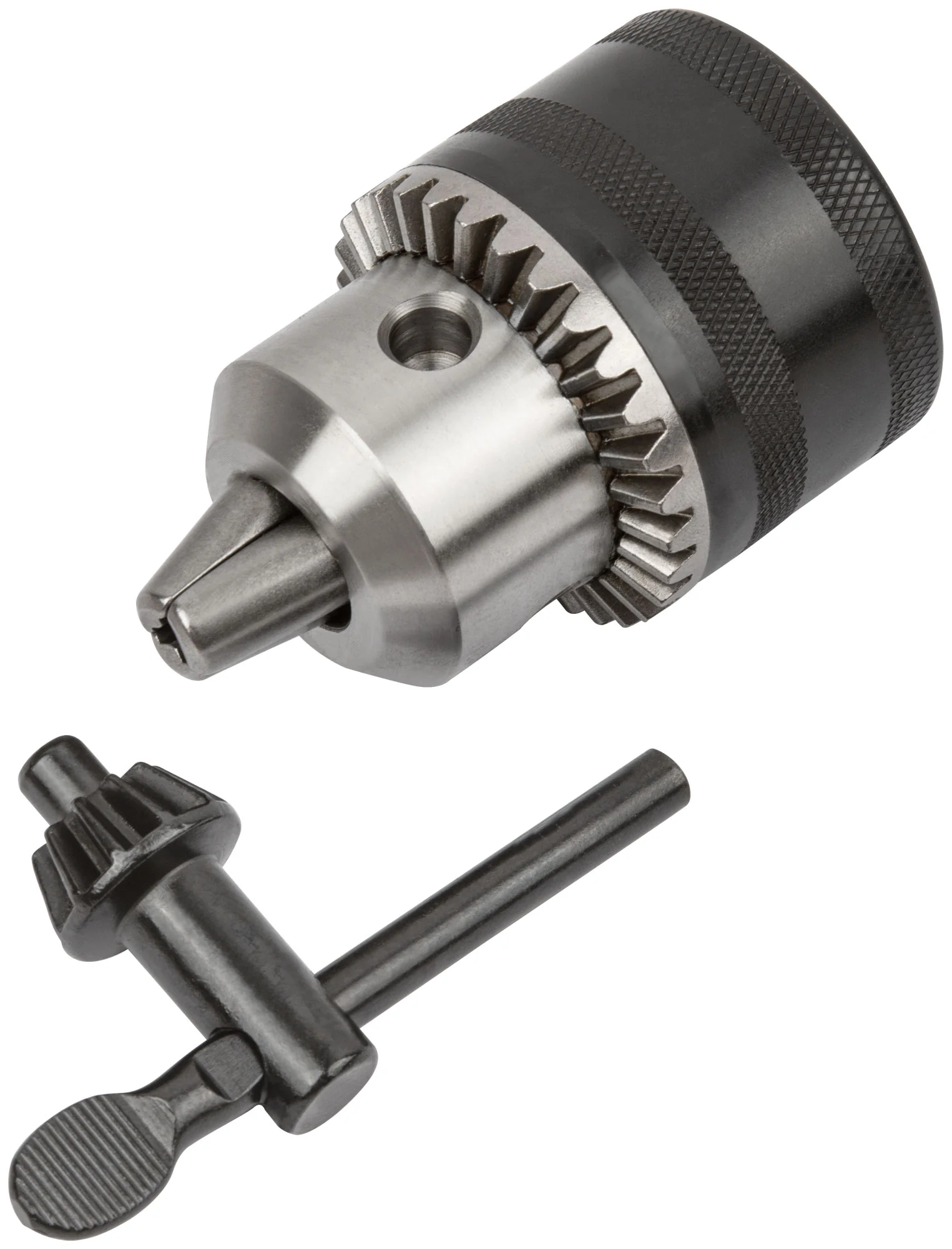 Патрон оснащен 3-х кулачковым механизмом и поставляется с Т-образным ключом, что облегчает смену сверл и гарантирует надежную фиксацию. Упакован в картонную коробку для удобства транспортировки и хранения.