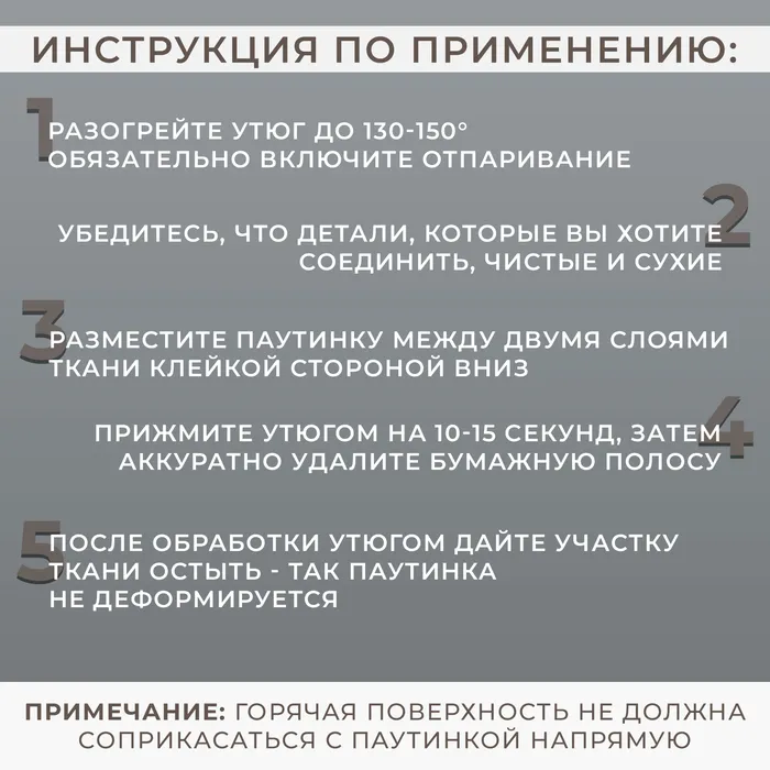 Паутинка подходит для мелкого ремонта одежды и подгиба низа изделий. Чтобы приклеить её, необходимо расположить изделие между двух тканей и проутюжить с изнаночной стороны. Главное, чтобы горячая поверхность не соприкасалась с паутинкой напрямую, иначе она оставит на одежде след.