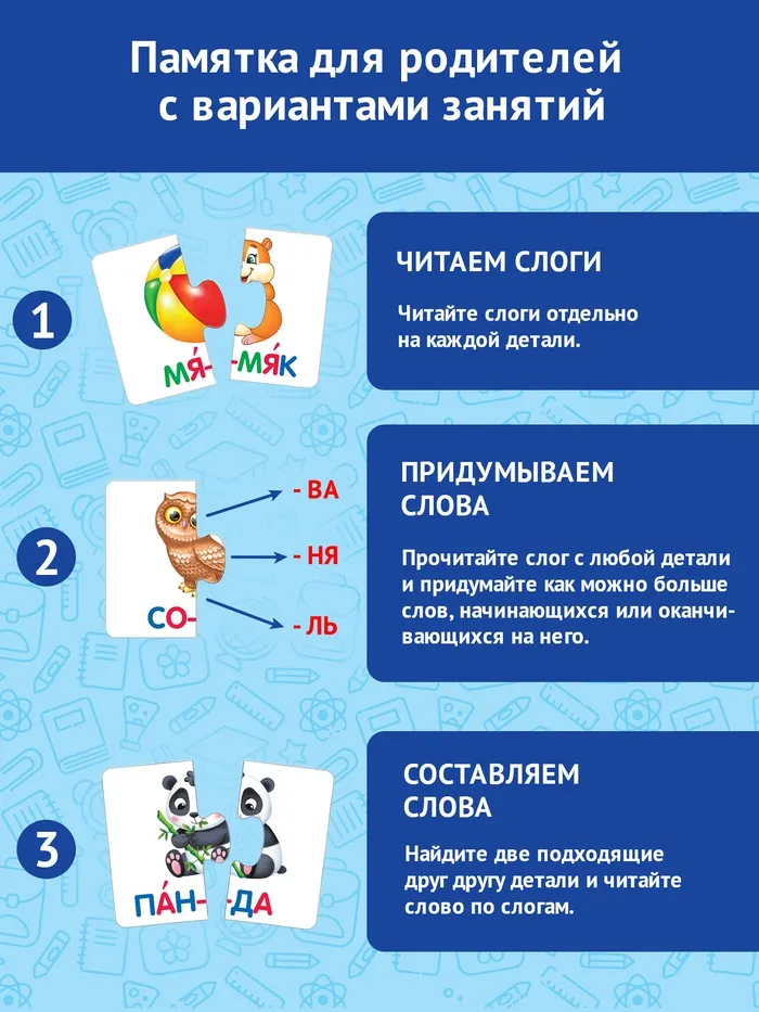 - Достаньте наугад любую деталь пазла и попросите ребёнка прочитать слог. Вместе придумайте как можно больше слов, начинающихся на него. Усложняйте задание, подбирая слова, заканчивающиеся на этот слог.
