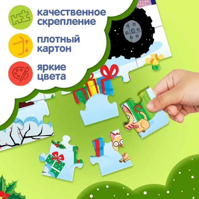 - Ребёнок соберёт все 24 детали в одно целое и получит красочную картинку размером 17,5 × 13 см.