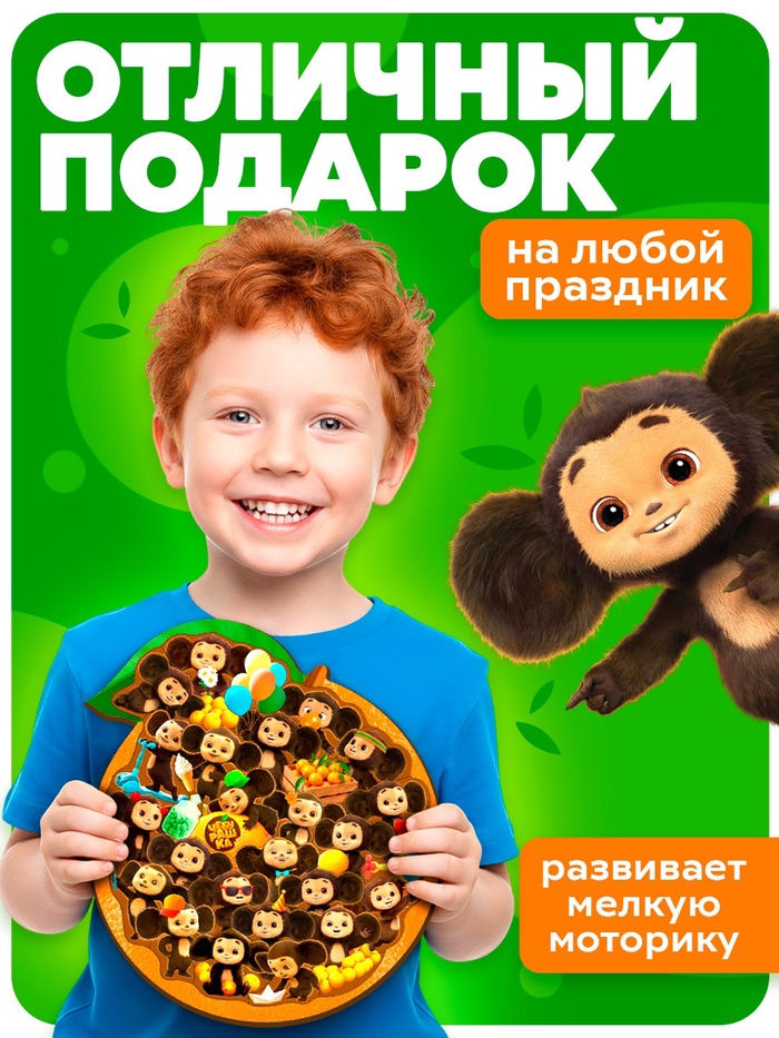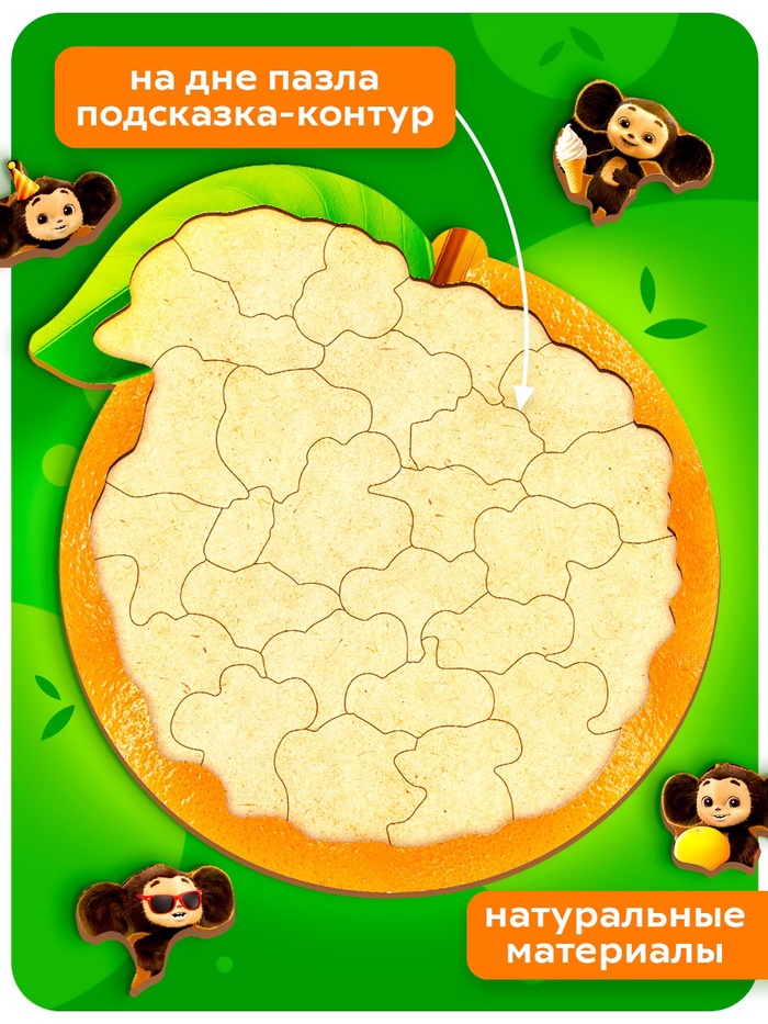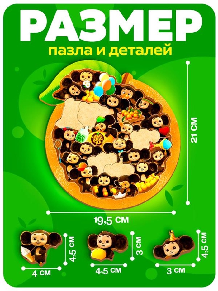 p>Увлекательный деревянный пазл в форме апельсина, украшенный ярким изображением любимого персонажа — Чебурашки. На картинке представлены многочисленные образы героя в разных ситуациях: с шариками, подарками, в праздничных шляпах, вместе с друзьями — всё это создаёт весёлую и добрую атмосферу, знакомую каждому поколению.