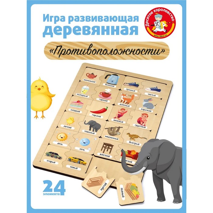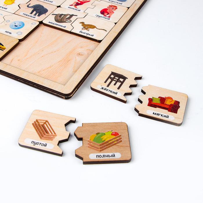 - Игра с деревянным пазлом «Противоположности» не только расширяет знания об окружающем мире, но и стимулирует развитие мелкой моторики рук, логики и усидчивости.