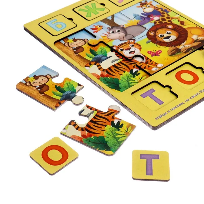 Вместе с музыкальным пазлом «Найди букву» ребёнок изучит, на какую букву начинается каждое животное из примера. Во время игры нужно рассмотреть картинку и показать, какой букве соответствует имя персонажа. Встроенный музыкальный чип сделает игру веселее и интереснее.
