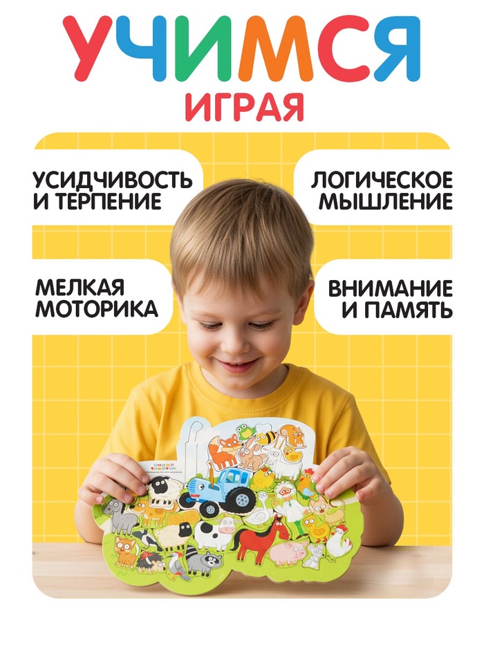 Представьте. Ваш малыш собирает синий трактор — и не просто так. Вокруг него раскрывается целый мир: коровы, курицы, лошади, овцы, утки и даже забавные зверюшки на полях. Он не просто играет — он узнаёт, кто живёт на ферме, как выглядят животные и что делают машины. А вы — получаете время для себя, зная, что ребёнок занят полезным делом.