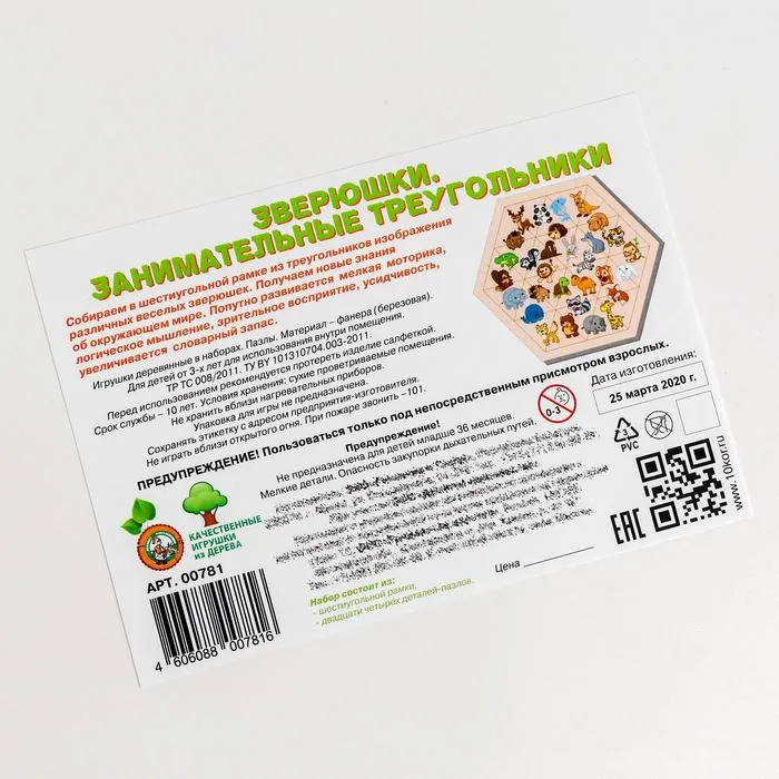 - Все детали пазла изготовлены из берёзовой фанеры и тщательно отшлифованы, чтобы в процессе игры ребёнок не получил занозу и не поранился.