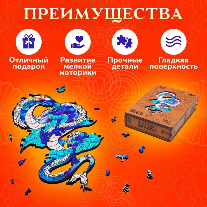 Деревянные фигурные пазлы «Спектральный дракон» - это магия, которая затягивает как детей от 12 лет, так и взрослых. Собирая каждый элемент этой удивительной головоломки, вы окунетесь в мир антистрессовой гармонии, который позволит вам расслабиться и поднять настроение.