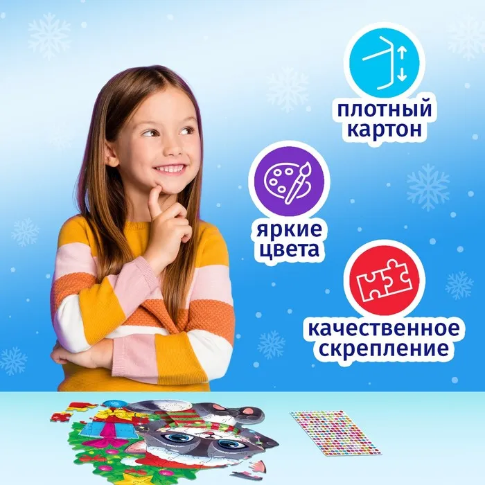 Ребёнок соберёт все 70 деталей в одно целое и украсит получившиеся изображение стразами.