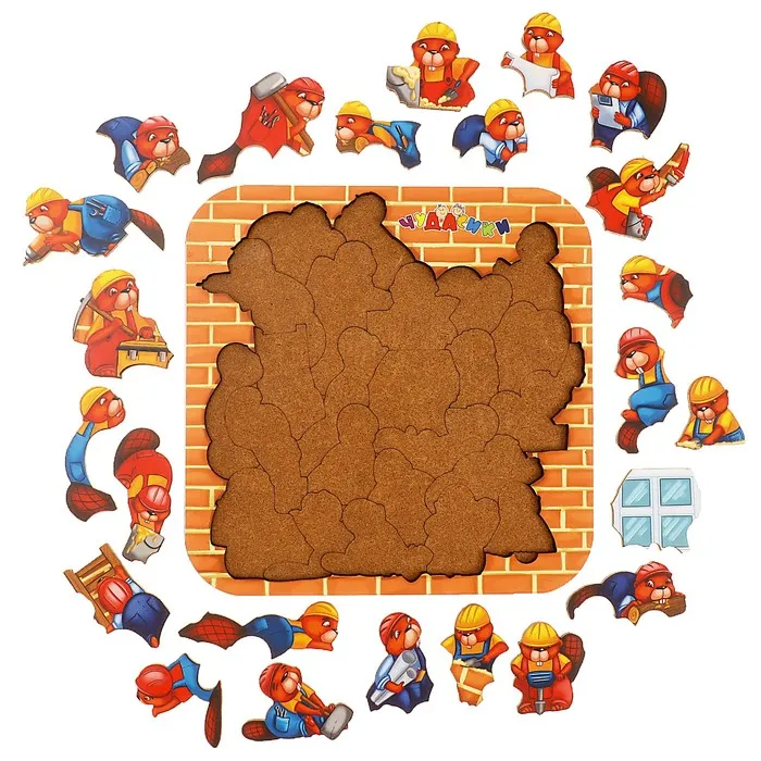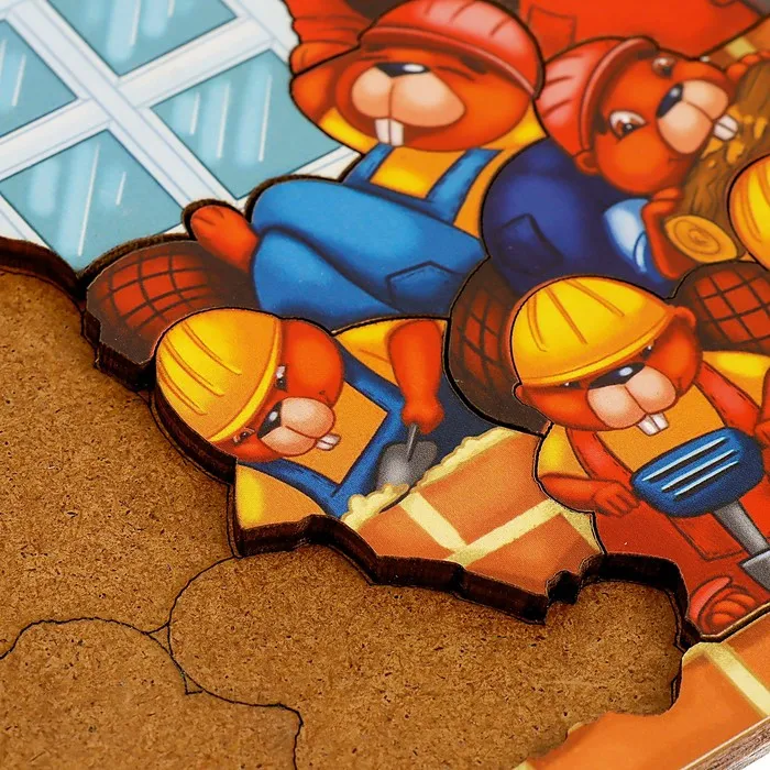 Пазл головоломка, развивающий «Бобры строители» изготовлен из фанеры и бумаги.