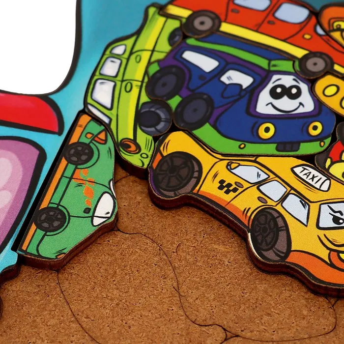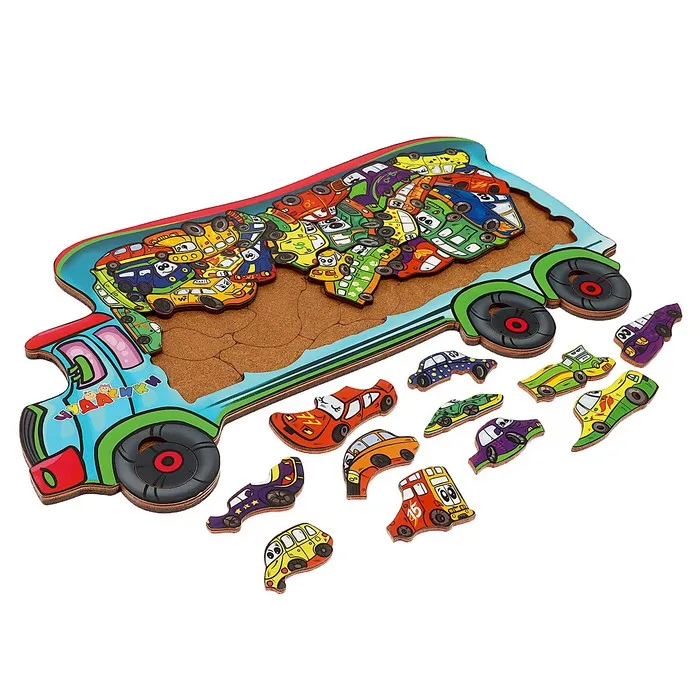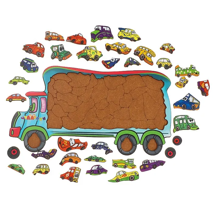 Пазл головоломка, развивающий «Грузовик с машинками» изготовлен из фанеры и бумаги.