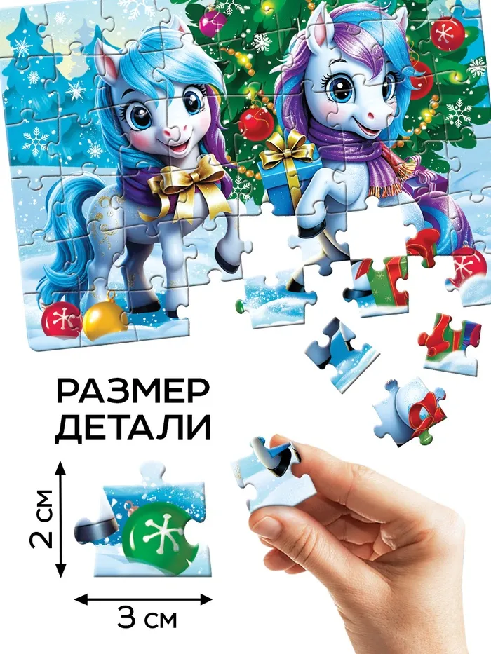 Этот новогодний пазл не только развлекает, но и помогает ребёнку развивать важные навыки. Поиск нужных деталей тренирует внимание и кратковременную память, а соединение элементов укрепляет мелкую моторику рук. Яркие иллюстрации с зимними пейзажами и милыми лошадками добавляют эмоциональный отклик и делают процесс ещё более увлекательным. Набор выполнен из безопасных материалов, что создаёт уверенность в его использовании для всей семьи.