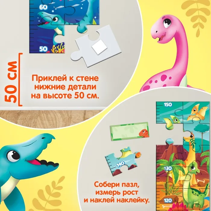 Соберите пазл вместе с ребёнком, закрепите его на стене и используйте как ростомер. Наклейки помогут отметить важные моменты роста, а яркий дизайн с динозавриками станет украшением комнаты.
