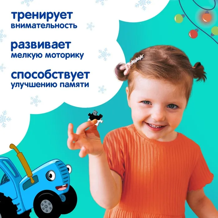 Пазл с новогодним сюжетом — то, что нужно для полезного и интересного досуга! Красочные иллюстрации с героями мультфильма «Синий трактор» заинтересуют малыша. Такой подарок поможет ребёнку скрасить ожидание Нового года и весело провести время.