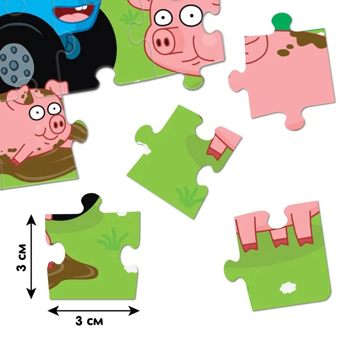 Сборка пазла — это не только увлекательное занятие, но и эффективный способ развить у ребёнка усидчивость и пространственное мышление. Яркие иллюстрации с персонажами мультфильма «Синий трактор» делают процесс ещё более интересным, а удобный размер элементов идеально подходит для маленьких ручек.