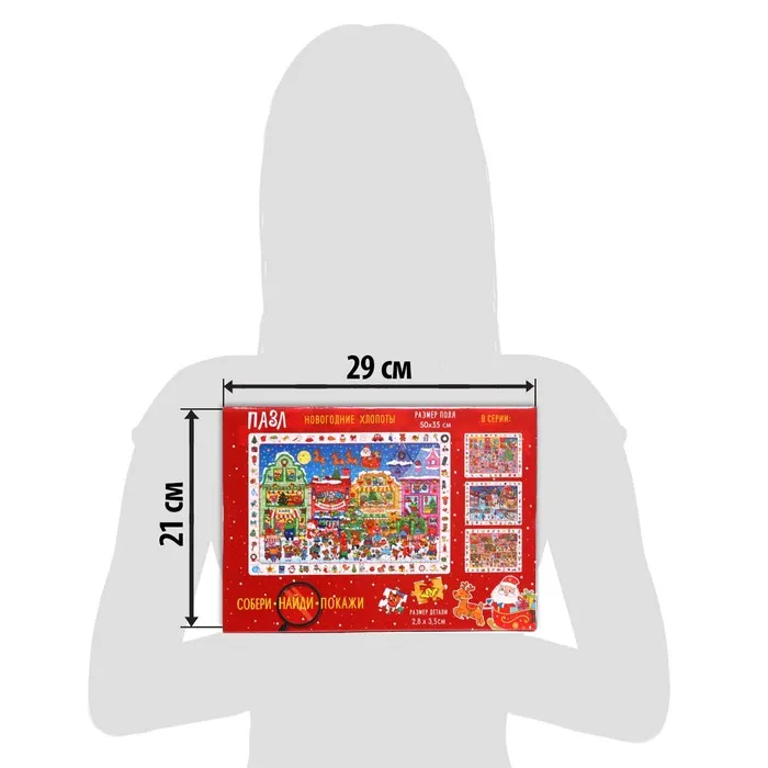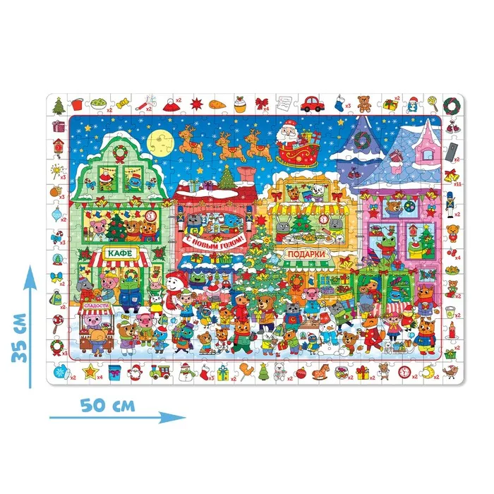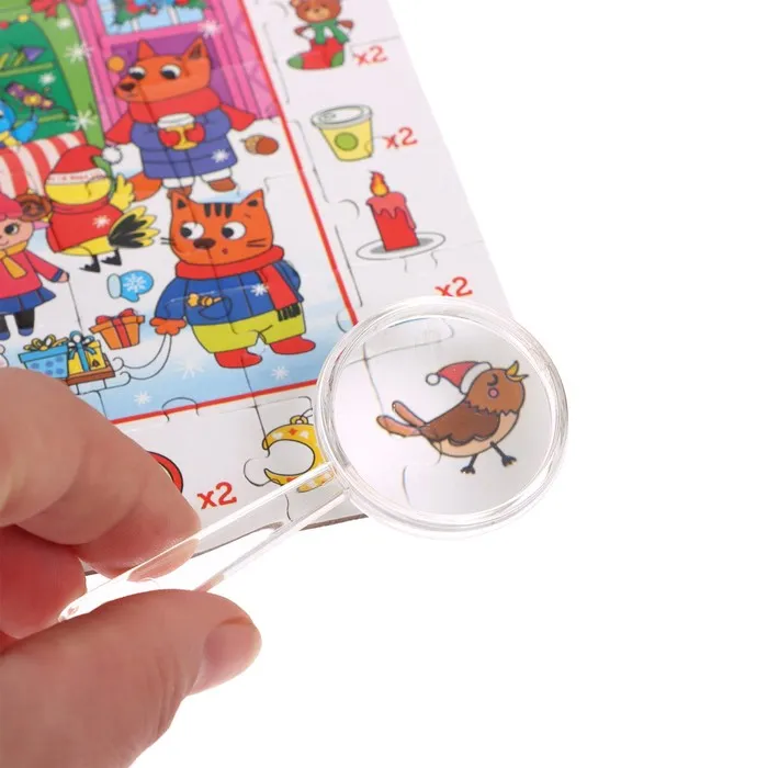 Ребёнок соберёт пазл из 260 деталей, а затем с помощью лупы найдёт разных персонажей и предметы с новогодней тематикой, тем самым расширит кругозор и потренирует внимательность.