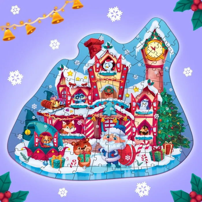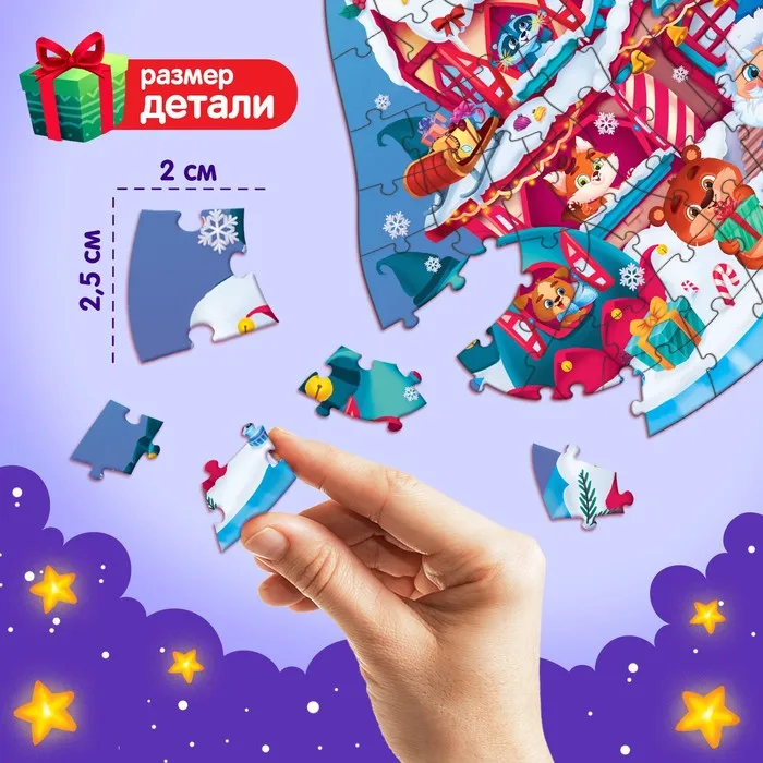 - Малыш соберёт все 104 детали в одно целое и получит красочный пазл с новогодним сюжетом.