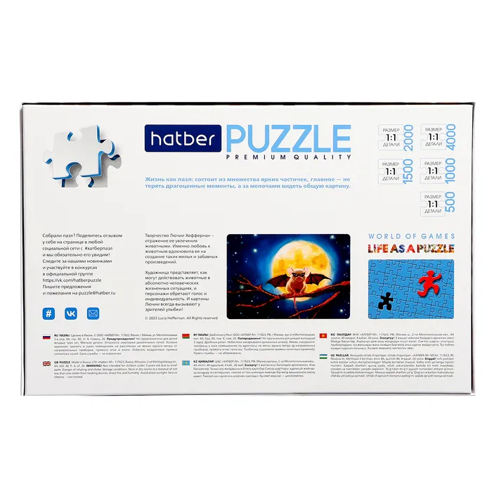 Пазл «Узнай себя- летучая мышь» — это классическая настольная головоломка для детей от 5 лет и всей семьи. В наборе — 500 картонных деталей, из которых собирается большая прямоугольная картинка.