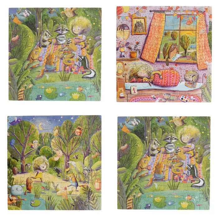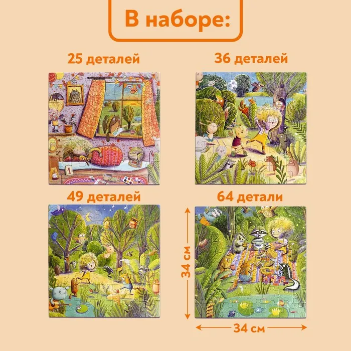 - В наборе 4 пазла с разным количеством деталей.