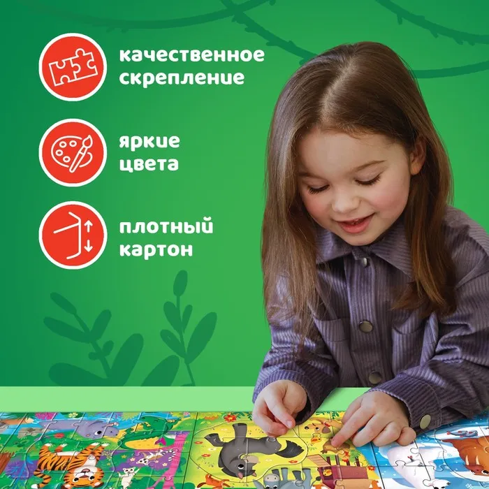 Ребёнок соберёт 4 пазла из 86 крупных деталей, а затем объединит их в одну большую красочную панораму.