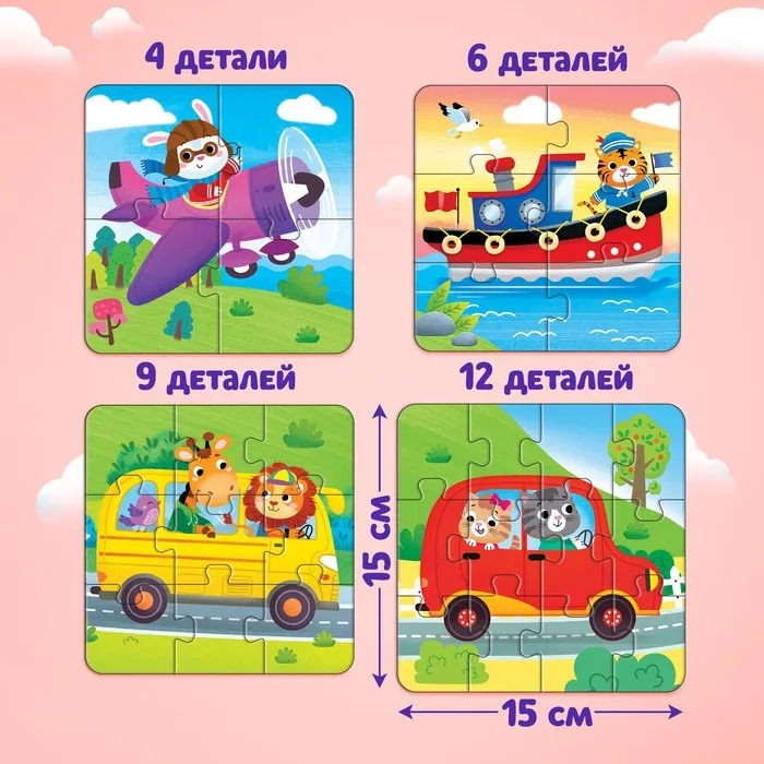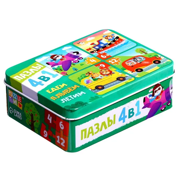 Пазлы 4 в 1 в металлической коробке «Едем, плывём, летим», 4, 6, 9, 12 деталей — Характеристики