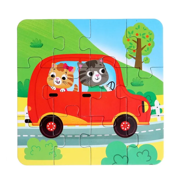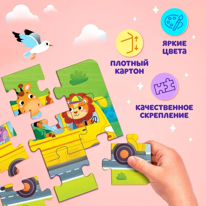 Ребёнок соберёт все детали в одно целое и получит 4 красочных картинки размером 15 × 15 см.