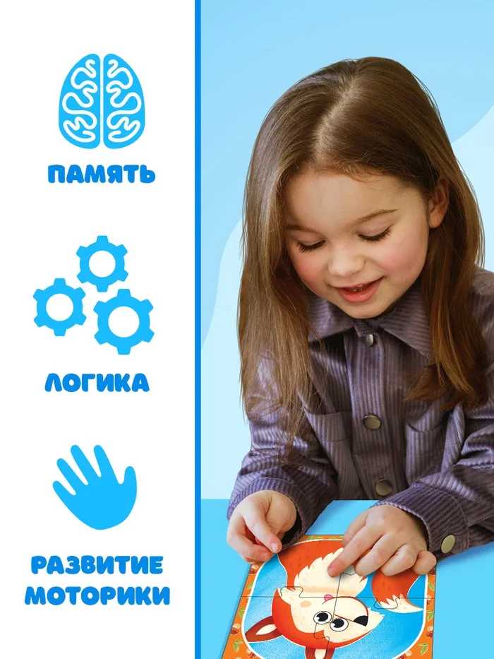 Сборка пазлов помогает детям развивать логическое мышление, учит различать цвета и находить связь между частями и целым. Игра тренирует усидчивость, улучшает мелкую моторику и кратковременную память, что важно для гармоничного развития ребёнка.