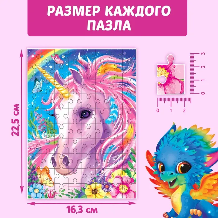 • 4 пазла с разными сюжетами: единороги, животные и котята.