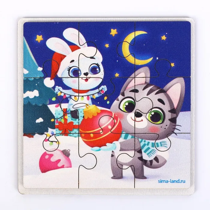 Пазлы деревянные на новый год «Зайка и котик», 9 деталей — Характеристики