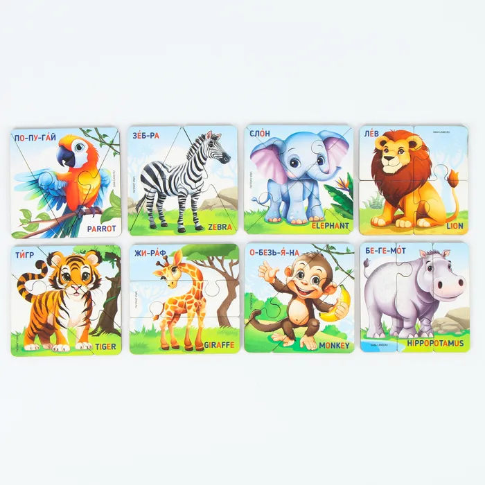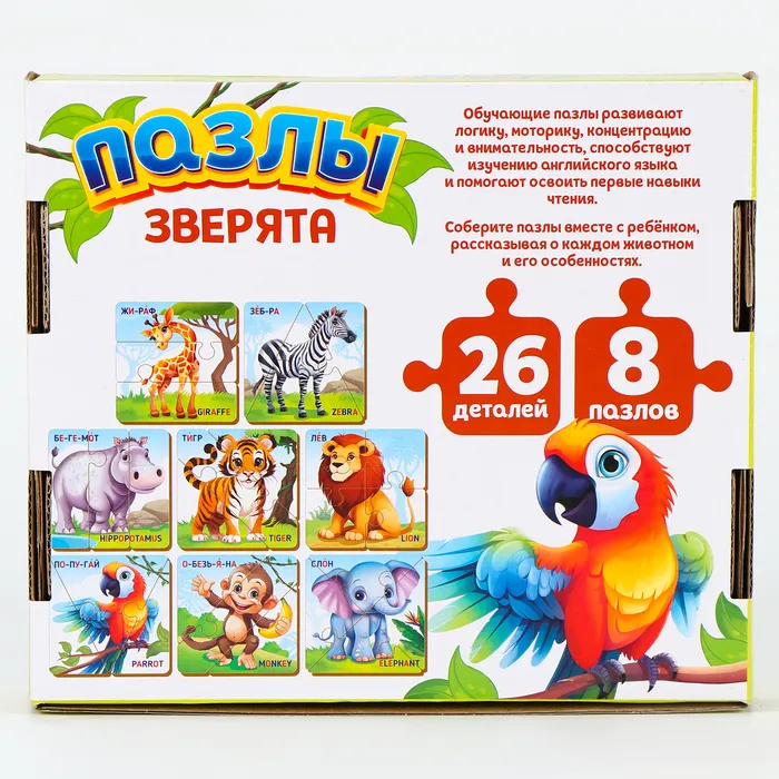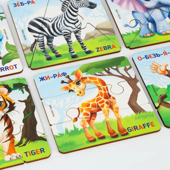 Во время сборки пазла дети могут изучить животный мир и узнать как пишется и читается название животного на английском и на русском языке. Это поможет расширить их знания об окружающем мире и научиться читать.