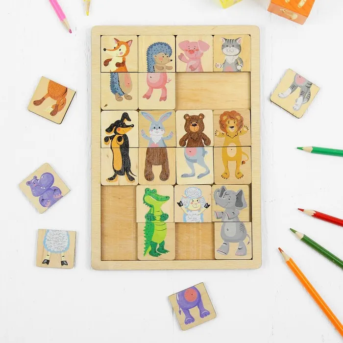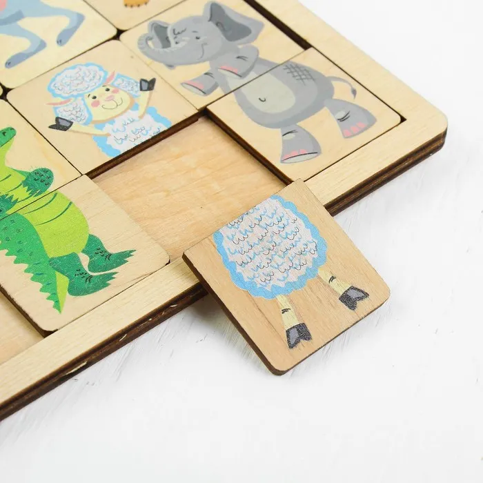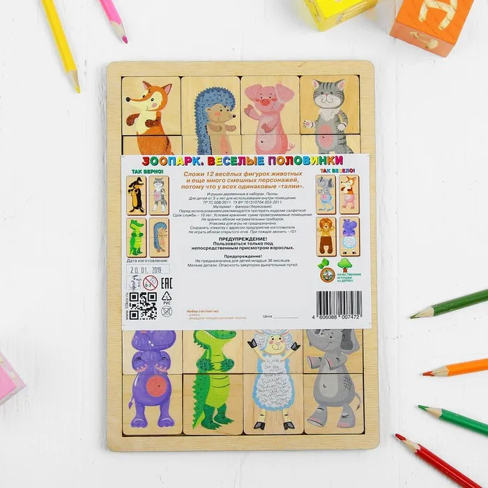 Деревянные пазлы «Зоопарк» — это увлекательная игра для детей от 3 лет, которая помогает изучать животных, развивать логическое мышление и расширять кругозор. В комплекте 24 детали, из которых можно собрать 12 фигурок животных или создать фантазийные существа.