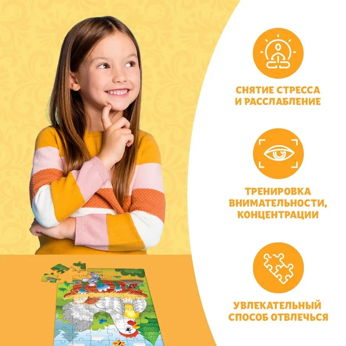 Ребёнок соберёт все 54 детали в одно целое, и получит красочную картинку размером 17,5 × 13 см.