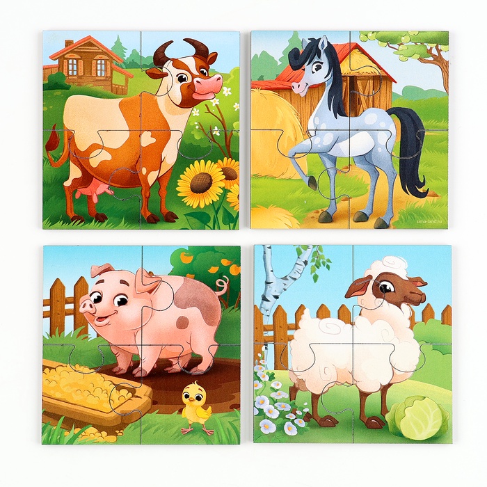 16 деталей.4 картинки 10 х 10 см.Пазлы рекомендованы для детей от 3 лет.В чём польза от занятий с пазлами