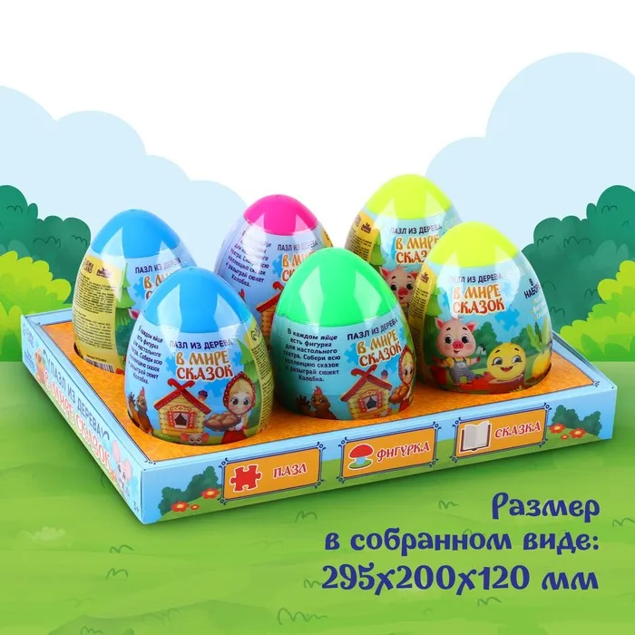 Деревянные пазлы в яйце «В мире сказок» — это увлекательный набор для детей и взрослых, который сочетает в себе игру, обучение и элемент сюрприза. Внутри каждого яйца вас ждёт уникальный пазл, фигурка и сказка. Какая именно русская народная сказка попадётся вам — остаётся загадкой до последнего момента, что делает процесс ещё более захватывающим.