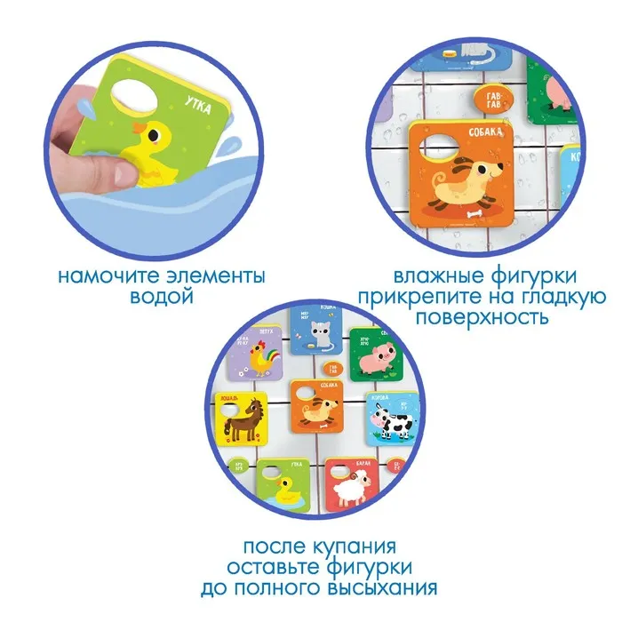 Забавные игрушки из мягкого материала не тонут в воде и при намокании приклеиваются к кафелю или ванне.
