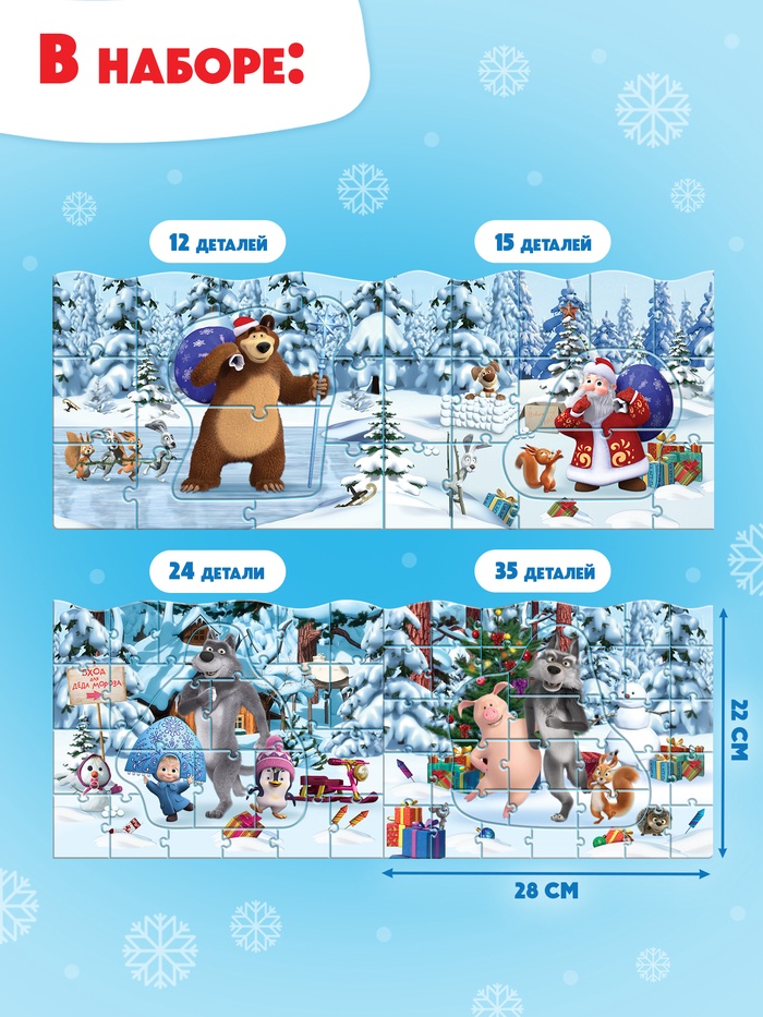 - В наборе 4 пазла с яркими иллюстрациями на тему Нового года и приключений Маши и Медведя.