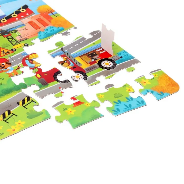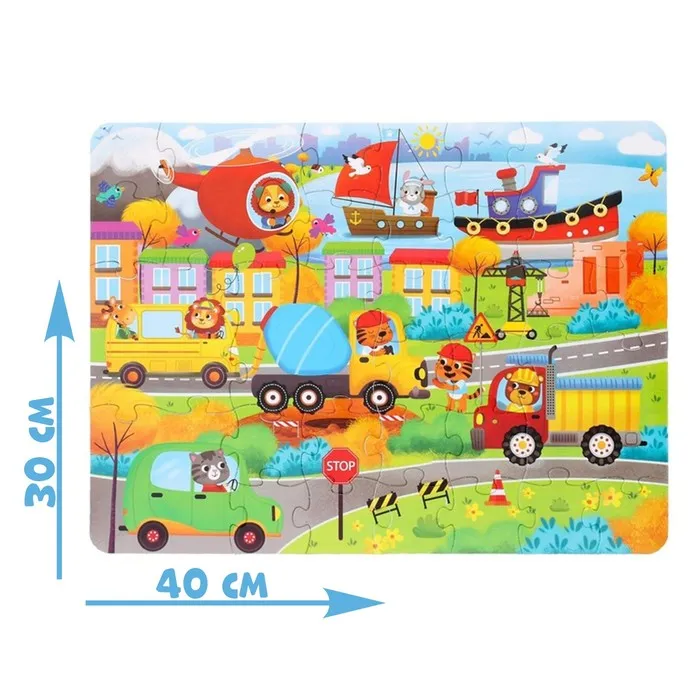 В коробке 30 деталей, детали двух разных размеров. Обычные маленькие и большие детали с окошками внутри. Собрав все детали вы получите картинку размером 40 × 30 см.
