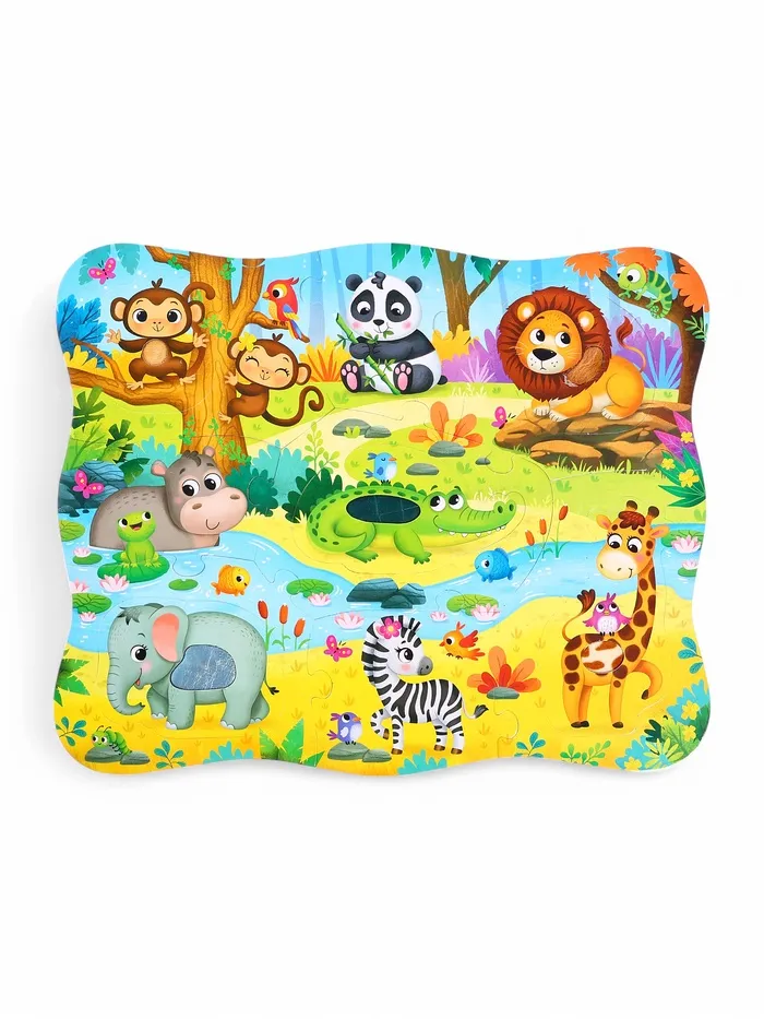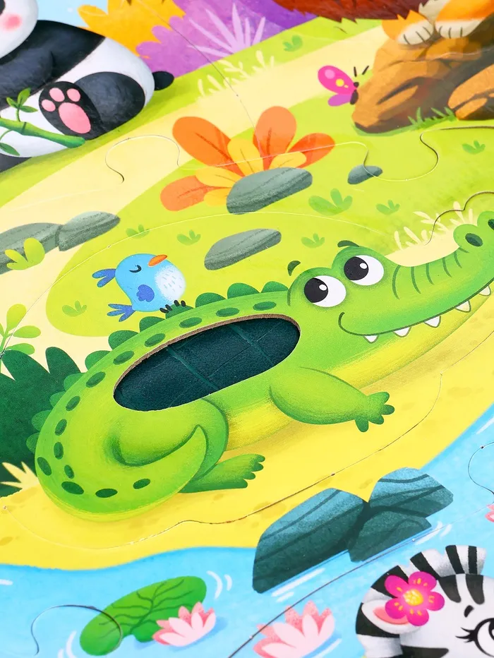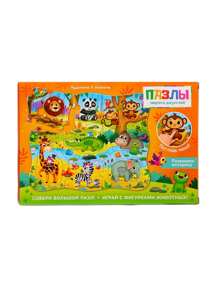 Пазлы с тактильными вставками «Зверята джунглей» разработаны специально для малышей от 3 лет. Детали большого размера удобно держать маленькими ручками.