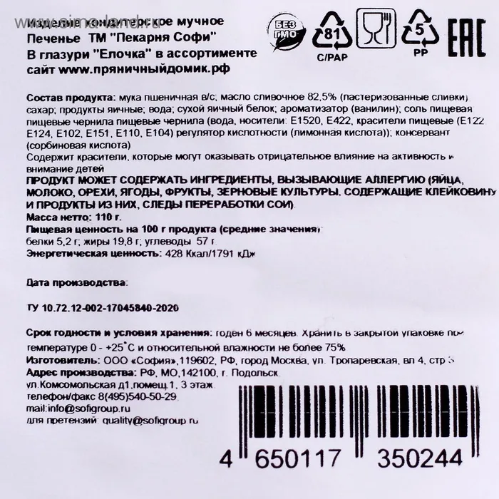 Печенье новогоднее «Елочка» в глазури с фотопечатью, 110 г — Характеристики