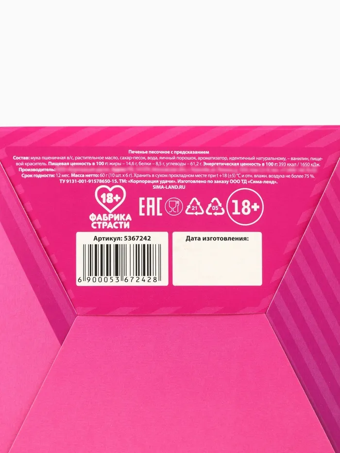 Печенье с предсказанием-заданием «Для тех, кто хочет попробовать всё», 60 г (10 шт. х 6 г). (18+) — Характеристики
